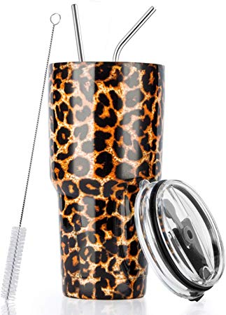 30oz Stainless Steel Insulated Leopard Tumbler Travel Mug with Straw Slider Lid, Cleaning Brush, Double Wall Vacuum