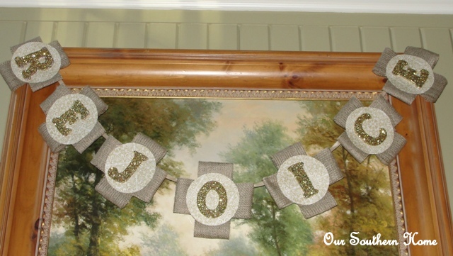 My rejoice bunting is new this year. I will have a tutorial post up later this week. It is a great project for the kids to help with. My 13 year old daughter took care of the painting glue and glittering of the letters. Once that was complete, it went fairly quickly (a DVR episode of Grey's Anatomy playing in the background).