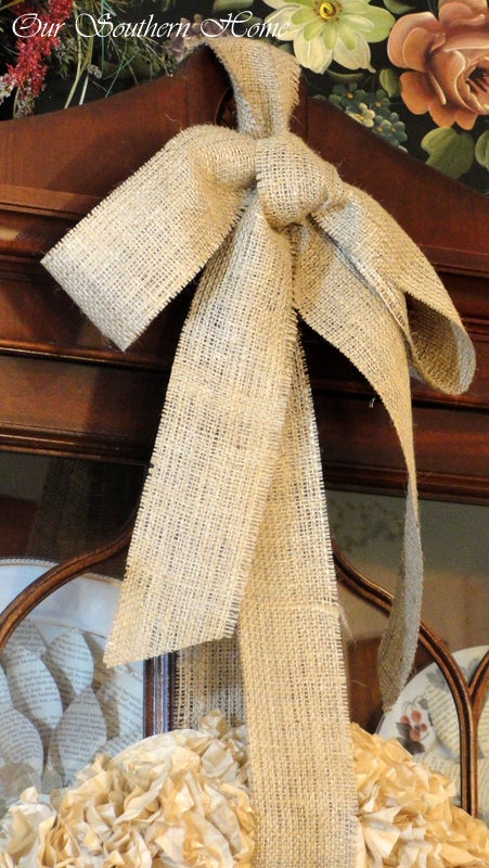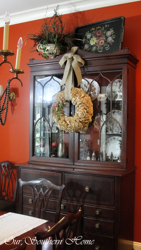 I love Command hooks. They do not damage surfaces and are great for hanging seasonal decor. I hung it upside down on the back of the china cabinet pediment. Then I made a burlap bow for hanging.