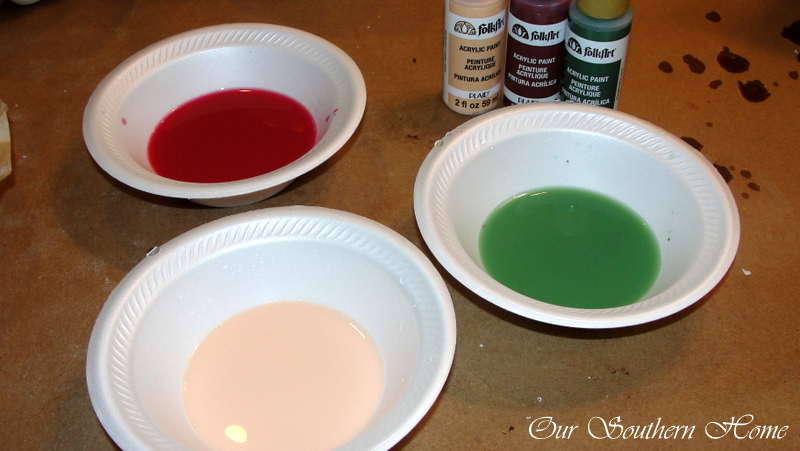 Add water to make the paint very thin. I didn't measure…..it's just very watered down. The brown paper for my work space sure has seen better days. Multiple projects were going on at the time…lots of multi-tasking!