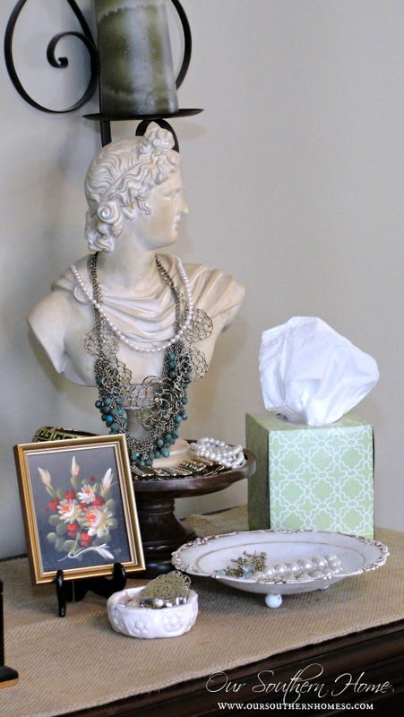Here's another look changer. I am so smitten with this size box and pattern. Gives off a little Bohemian vibe! Would you believe that the wooden pedestal, the white painted floral bowl and mini vintage oil art were thrifty finds? Busts are great for displaying your favorite jewelry. The small ceramic bowl was a school project gift from my daughter. She even knew I'd love it in a neutral color so I could use it anywhere. She's got an eye!