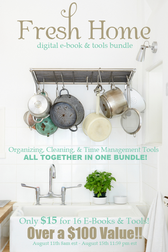 A Bowl Full of Lemons and Clean Mama have come together to bring you an amazing set of e-books and tools. These fantastic resources will help you get your house clean and organized and your time in order. This exclusive bundle will only be available until 11:59pm EST. on August 15th, so grab yours now! While this bundle is valued at over $100, it is available to you, our readers, for only $15 (or less than $1.00 per e-book or tool)! “Fresh Home” is the perfect bundle to get you back on track as a new school year begins and new routines are being implemented in your home.