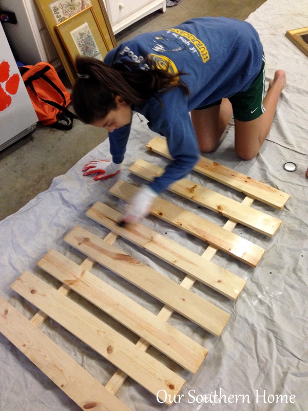 After that dried, the boards were coated with a couple of coats of Minwax Wood Stain in Dark Walnut. A foam brush was used only because I was out of rags! I highly recommend the rags or staining pad opposed to the foam brush. It is just too drippy and runny….hence the sloppy backside look….but no one will see it!