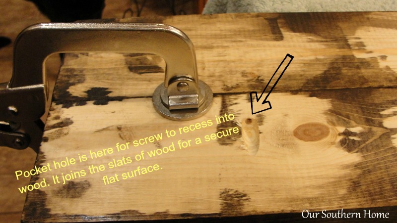 After the stain had thoroughly dried, we joined the boards using my Kreg Jig. This tool makes joining wood together seamlessly a breeze!!! I highly recommend it! If you do not have the Jig, you can attach the boards with 2 or 3 furring strips on the back with screws depending on the size and support needed. Click–>>You can find Kreg Jig on Amazon.