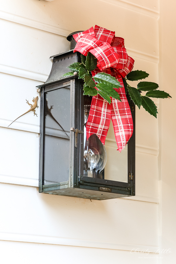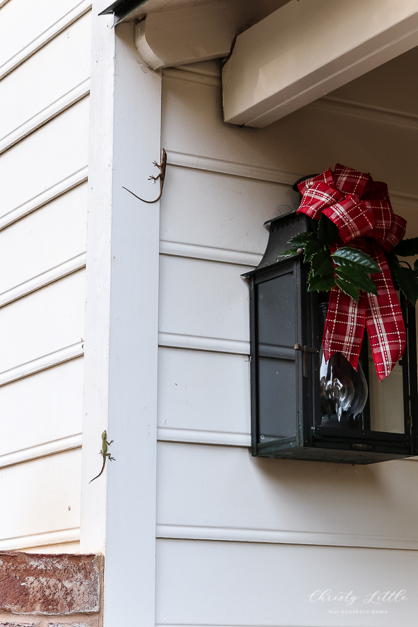 We have lizards too. The dog loves to chase them but she is rarely successful. Your porch is just lovely. Your home is gorgeous. I love the lantern with the sprig of holly.