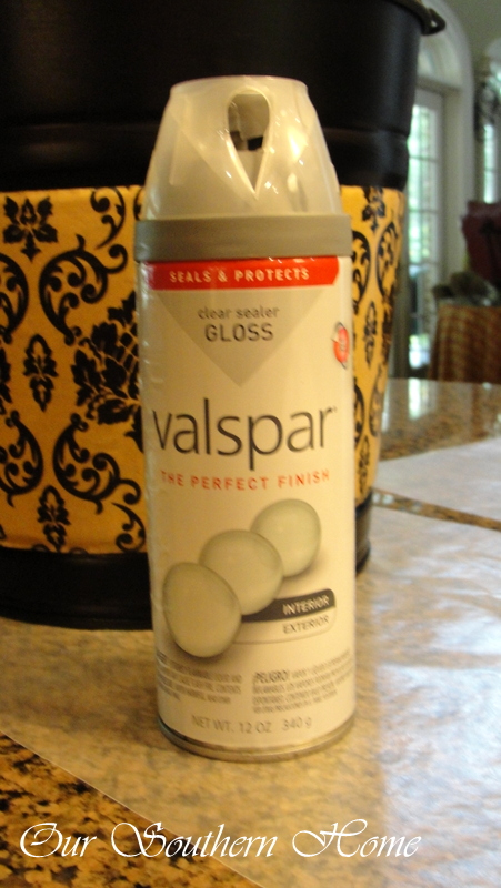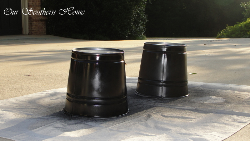 First, you will want to remove the stickers so you have a very clean surface. I used Goo Gone. Make sure the bucket is thoroughly dry before spraying with one coat primer. I used Valspar grey because that is what I had on hand. I do use grey a lot because it is easier for me to see when covering pieces especially in white. It is just a personal preference. Let this dry completely before spraying the black. Don't be tempted to skip the priming step. Always remember that a little primer new hurt anyone! Then spray two coats of your flat black drying in between. Notice that I sprayed the top interior of the bucket so no potential silver would show. I also sprayed the bottom in case I ever decided to use it as a stand. I sprayed one coat upside down and the other right side up. This insured that all grooved areas were coated.