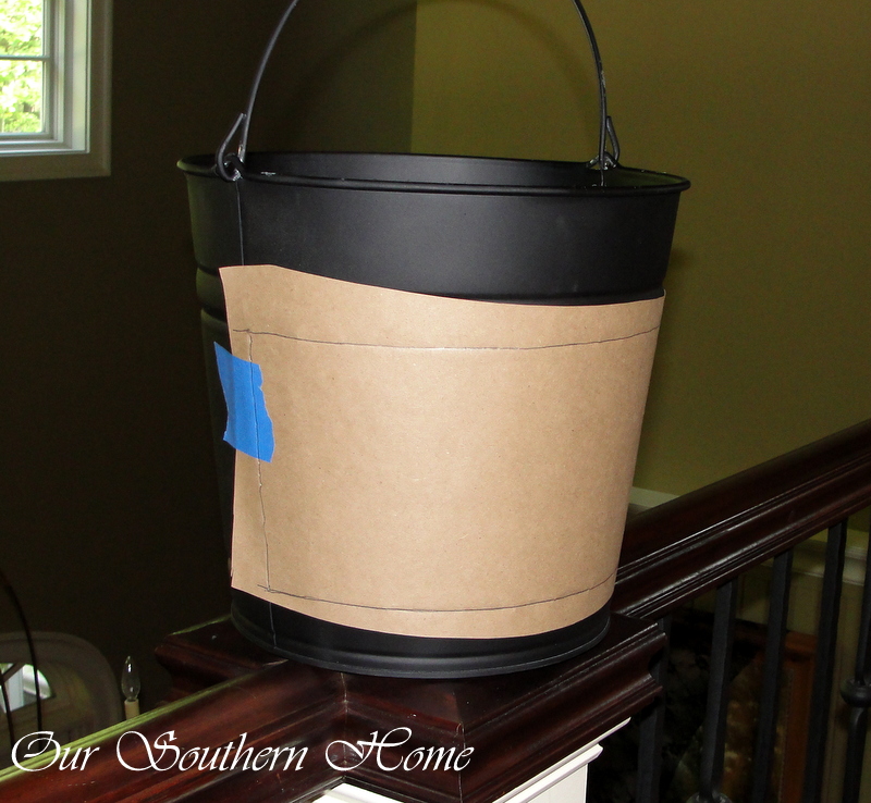 I used a flexible tape measure like you'd use for body measurements or clothing construction since I was working with a rounded surface. As you will see in the next photo, the bucket has a divider band running down each side. This really is great in that you can work with 1/2 the area at a time. I cut a strip of the pattern paper a couple of inches longer and wider than the area needed. Since the bucket is slightly graduated in shape I taped this piece to the bucket using painters tape. Regular scotch tape will not stick-I tried! Painters tape will not cause damage either. Use a pencil and trace out the area to decoupage. This is simple since I used the grove as a guide. You only need to make 1 pattern and use it on each section. Be sure to remember or mark which part is top and bottom since it is graduated. Cut it out and make sure it is a nice fit.