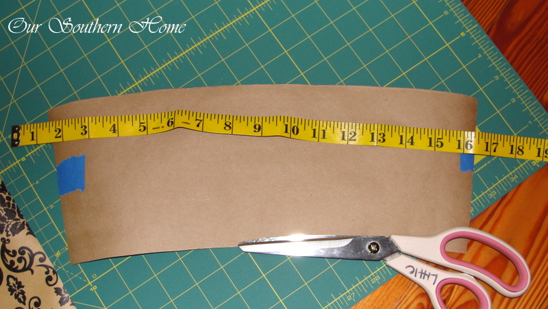 After your buckets have thoroughly dried, you will want to make a pattern for your printed paper. This is a picture of the items that I used for the next set of steps. You could really use any kind of paper you have on hand. I had a roll of craft paper that I used. My decorative paper is wrapping paper.