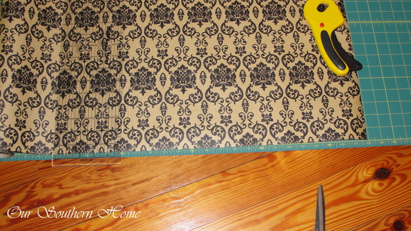 Now, you by no means have to have the rotary cutter and mat. I have had this for several years for various other sewing and craft projects. If you are an avid crafter, this would be a handy investment. My wrapping paper has a definite pattern and I wanted to keep the exact pattern shape. You don't have to be so exact since the paper will wrap around the sides. You could easily use a carpenter's square and yard stick as well. Use what you have!