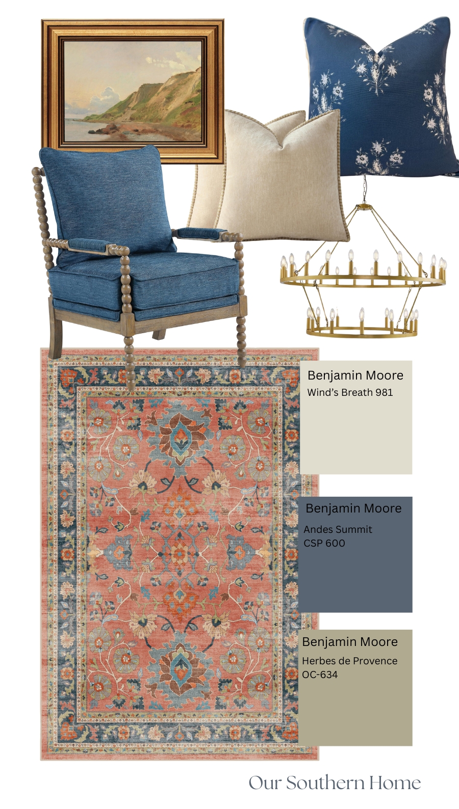 A classic living room mood board built around Benjamin Moore Wind’s Breath (981). This palette layers a coral vintage-style rug with tailored blue upholstery, soft neutral pillows, warm brass lighting, and timeless artwork. A cohesive design plan that blends comfort with classic Southern style.