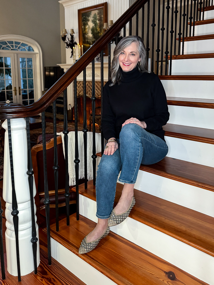 I rarely wear heels except on a dressy occasion or at church. This sweater is old, but perfectly chic with a fun flat.