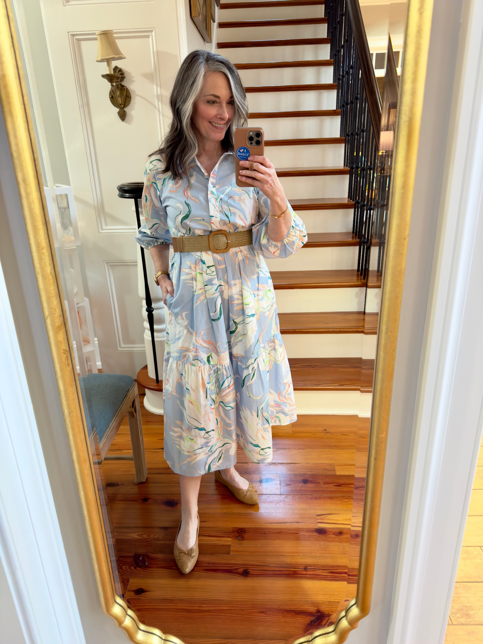 I wear it loose and belted. It's a dress style that Anthropologie stocks all the time. The colors and patterns change with the season. My colorway is no longer available, but I'll share a couple below for fall.