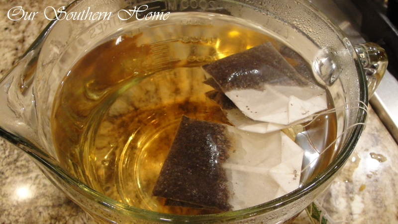 Pour the 2 quarts of boiling water (or pretty close amount….doesn't have to be exact) into the Pyrex and stir to dissolve the sugar. Add the tea bags and steep for about 30 minutes.