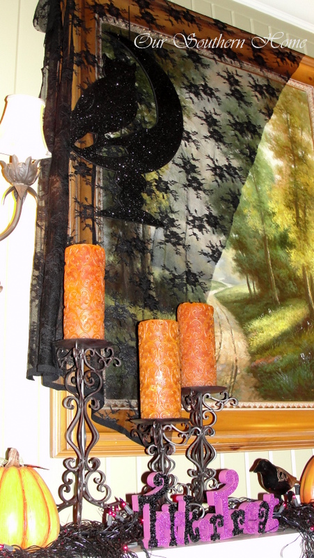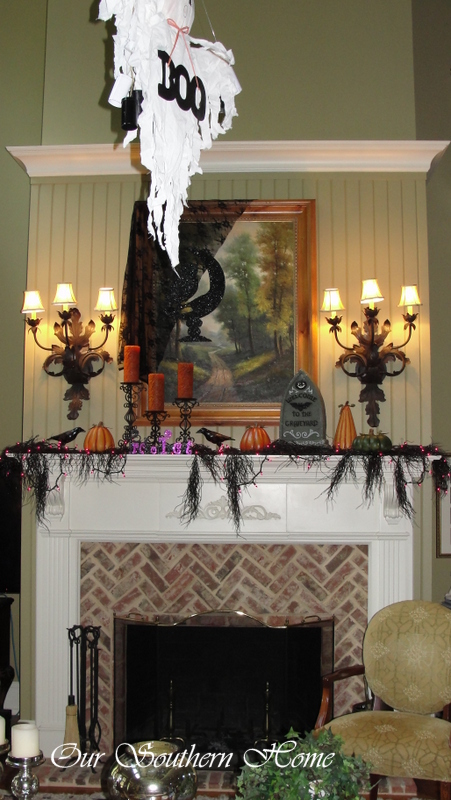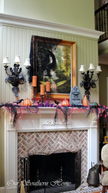 Happy Halloween Y'all! Welcome to our Spooky Halloween Mantel! Turn out the lights, light the candles, cue up the music….Michael Jackson's Thriller in the background. Where is the fog machine? Yes, it is Fall… and Halloween is just around that scary corner! Please enjoy my Halloween mantel. Notice all the fall elements. As soon as Halloween is in the grave, I'll remove it and just add a few more twigs, leaves and gourds to welcome Thanksgiving!