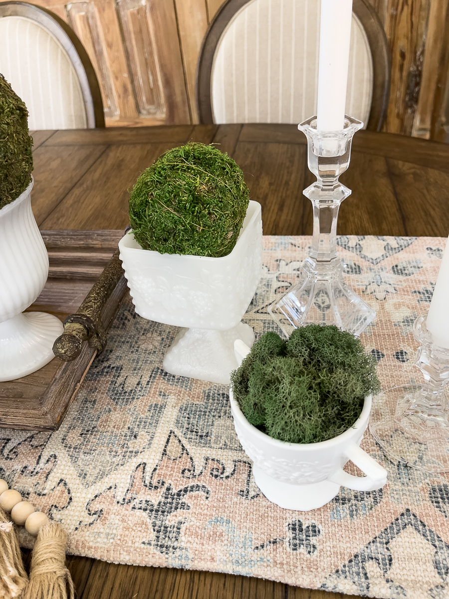 Your white milk glass pieces are perfect for spring! I’ve been collecting them at the thrift store whenever I find them. You can’t go wrong with white decor pieces! Besides they match Bentley.